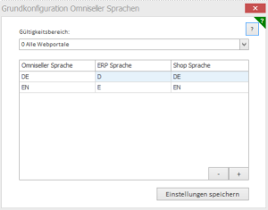 Wählen Sie den Gültigkeitsbereich aus dem Dropdown-Menü. Legen Sie die entsprechenden Sprachen für OmniSeller, ERP und Shop fest. Um eine weitere Sprachkombination hinzuzufügen, klicken Sie auf das „+“-Symbol. Um eine Sprache zu entfernen, wählen Sie die Zeile aus und klicken Sie auf das „-“-Symbol. Klicken Sie auf „Einstellungen speichern“, um Ihre Änderungen zu übernehmen.