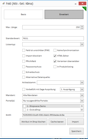 Hier hat man die Möglichkeit, ein Attributfeld mit einem Wert aus dem ERP vor zu Belegen. Hierfür muss man nur den Haken setzen und das entsprechende Feld aus dem Artikelstamm zuordnen.