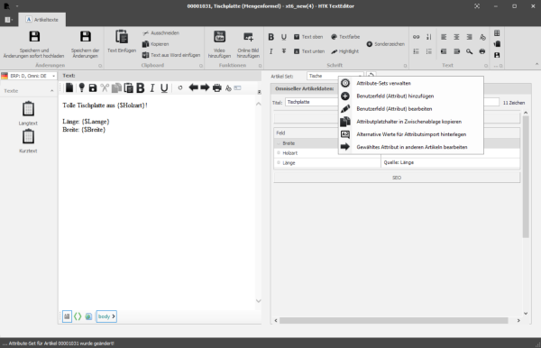 Breite und Länge, welche aus den Sage Artikelstamm Daten gezogen werden, werden hier mittels {$AttributName} in den Text mit eingebunden. Wichtig ist, dass man für den Namen in der geschweiften Klammer den technischen Namen des Attributs verwenden muss und nicht die Bezeichnung. Die im OmniSeller gepflegten Attribute können so im Text eingebunden werden.