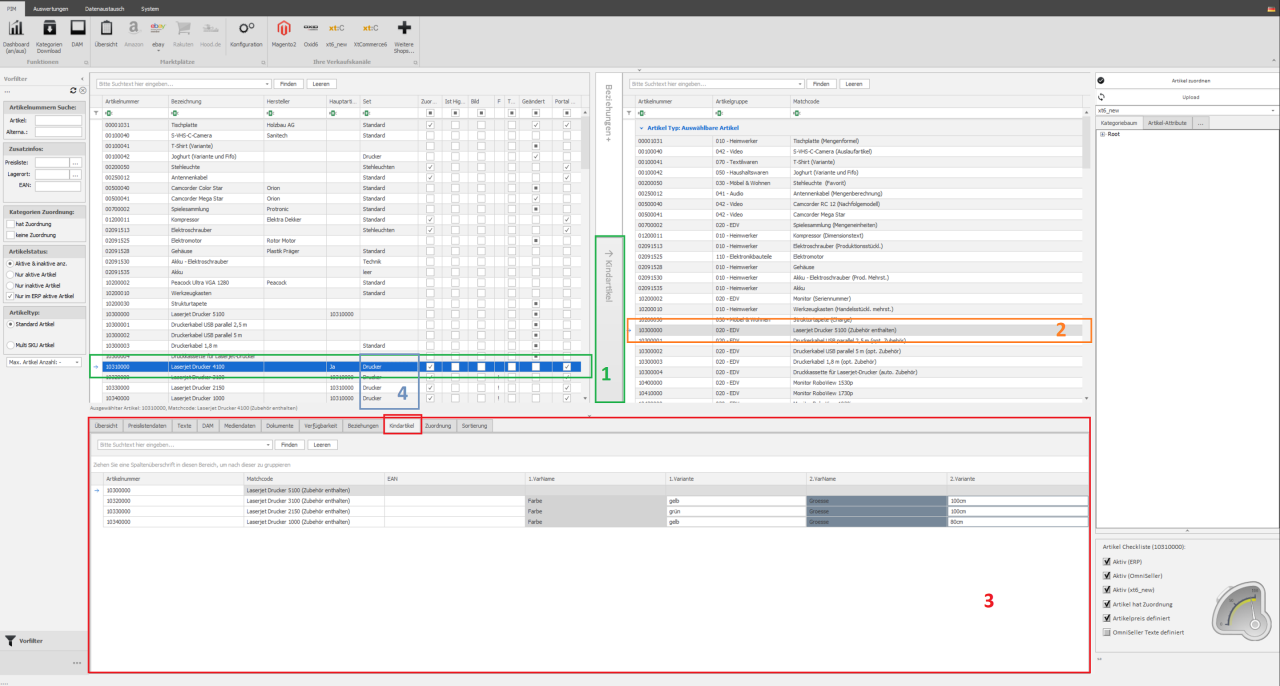 1: Gewünschter Hauptartikel auswählen und auf der rechten Seite die Leiste mit "Kindartikel" öffnen, sodass sich das zweite Fenster öffnet (Beachte, dass Vaterartikel in den meisten Shopsystem nicht kaufbar sind und hier eventuell ein Dummy Artikel in Sage erstellt werden muss der als Vater dient.