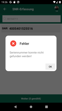 Die Anzahl der erfassten/gewählten Seriennummern ergibt sich aus der Anzahl an grün markierten Zeilen. Wenn Sie eine Seriennummer scannen die bereits Bestandteil der Liste ist, wird die Zeile automatisch Grün. Sollten Sie eine falsche Seriennummer erfasst haben, oder versehentlich eine falsche Seriennummer gewählt/gescannt haben, so können sie die entsprechende Zeile einfach antippen. Im Modus Auswahl kann eine Fehlermeldung erscheinen wenn Sie eine nicht vorhandene Seriennummer scannen. Nicht grün markierte Zeilen werden nicht gewählt und (im Modus Erfassung) verworfen. Am unteren Bildschirmrand kann je nach Konfiguration der Seriennummerngenerator erscheinen. Im Modus Auswahl kann Ihnen hier zusätzlich auch eine Chargennummer angezeigt werden, wenn es sich um einen Chargen und Seriennummernpflichtigen Kombiartikel handelt. Die Seriennummernerfassung kann je nachdem von welcher Funktion aus Sie aufgerufen wird in 3 verschiedenen Modi geöffnet werden: