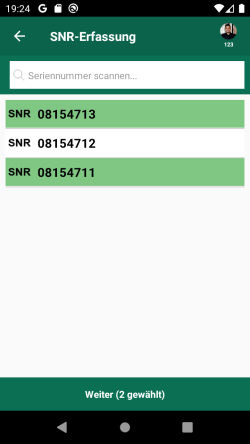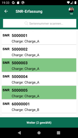 - Erfassen & Auswählen: Es werden neue Seriennummern der Liste an Seriennummern hinzugefügt und können zusätzlich aus einer vorgegebenen Liste an Seriennummern ausgewählt.