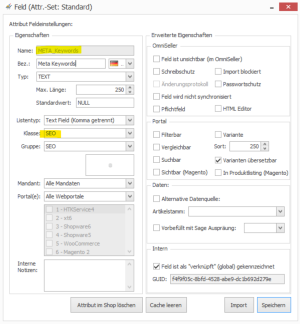 Hierfür müssen im OmniSeller entsprechende Attribute angelegt werden. Es folgt nun eine Auflistung der Shop-Felder und deren dazugehörige Attribute im OmniSeller.